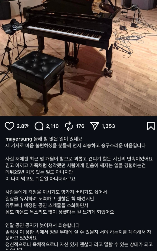 성시경 본인도 자신의 인스타그램을 통해 “올해 참 많은 일이 있었다… 믿고 아끼며 가족처럼 생각했던 사람에게 믿음이 깨지는 일을 경험했다”는 고백을 하며 충격과 심적 고통을 토로한 상태입니다.