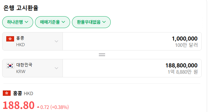 1 홍콩달러 ≒ 188원 선 - 따라서, 100만 홍콩달러 → 약 1억 8,00만 원 ~ 1억 8,800만 원 정도로 추정됩니다.
